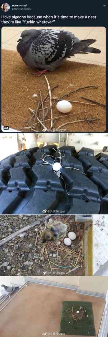 网友分享了关于鸽子下蛋筑巢的图片。
